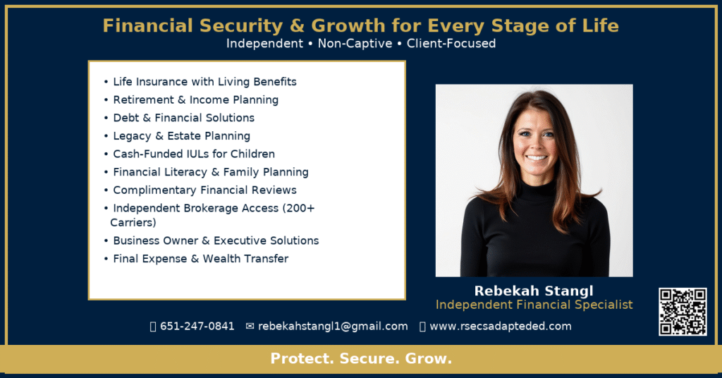 Reach out for a complimentary financial literacy session to see how you can secure the future of your dreams regardless of your income level @ rebekahstangl1@gmail.com or 651-247-0841